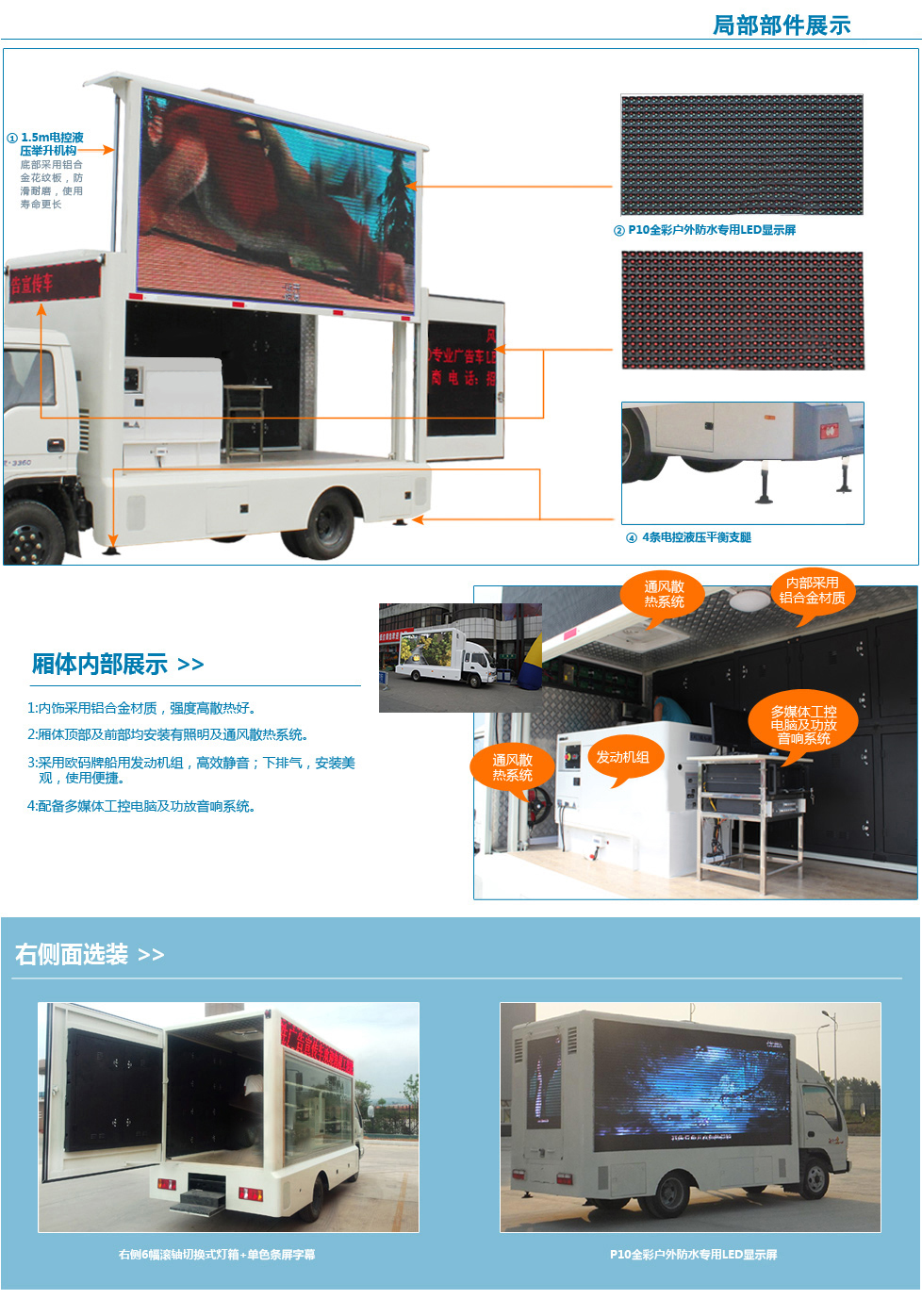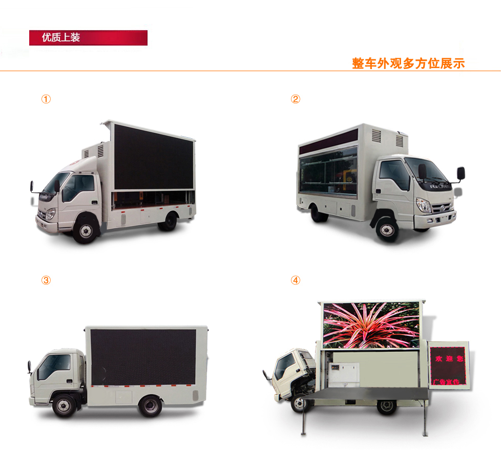 標準: 標配:主駕駛側為全戶外高清防水車載防震全彩屏,副駕駛側為數(shù)字滾軸燈箱外加鋼化玻璃,加單色條屏。5cm復合鋼架廂體,高檔木質(zhì)內(nèi)飾:廂體為圓弧形或者直角形鋼骨架結構,地板鋁花紋板、機電一體化控制、循環(huán)通風降溫裝置、安全智能內(nèi)外網(wǎng)配電切換系統(tǒng)、歐碼靜音柴油發(fā)電機組、千兆媒體控制系統(tǒng)、防震工控電腦一臺、功放一臺和防水音柱四臺。